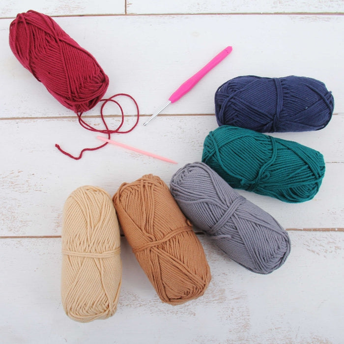 - This set includes one skein each of beige, light beige, grey, navy, burgundy, and dark green.
