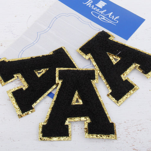 Black Chenille Letter Patches - Set of 3 Letters - Large 8 cm Chenille with Gold Glitter