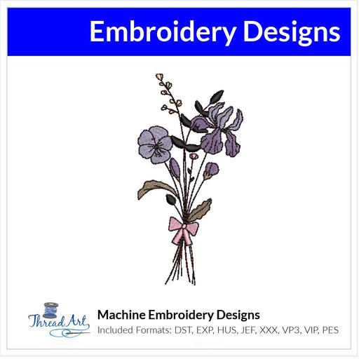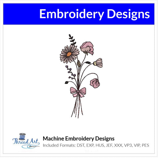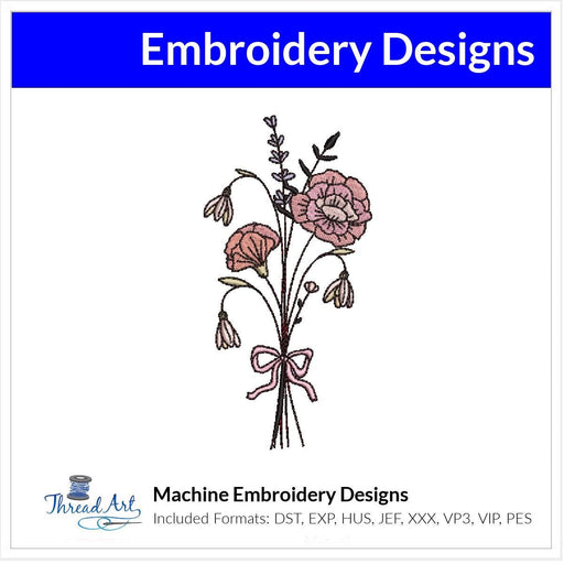 Single machine embroidery design. Set includes 5" tall floral bouquet and includes 8 popular formats: DST, EXP, HUS, JEF, VIP, PES, VP3, XXX. Conv...