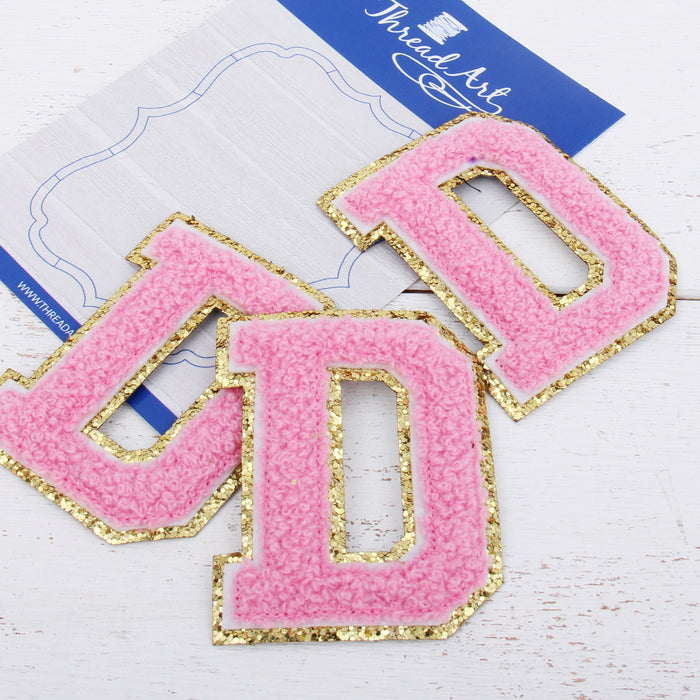 Pink Chenille Letter Patches - Sets of 3 Letters - Large 8 cm Chenille with Gold Glitter