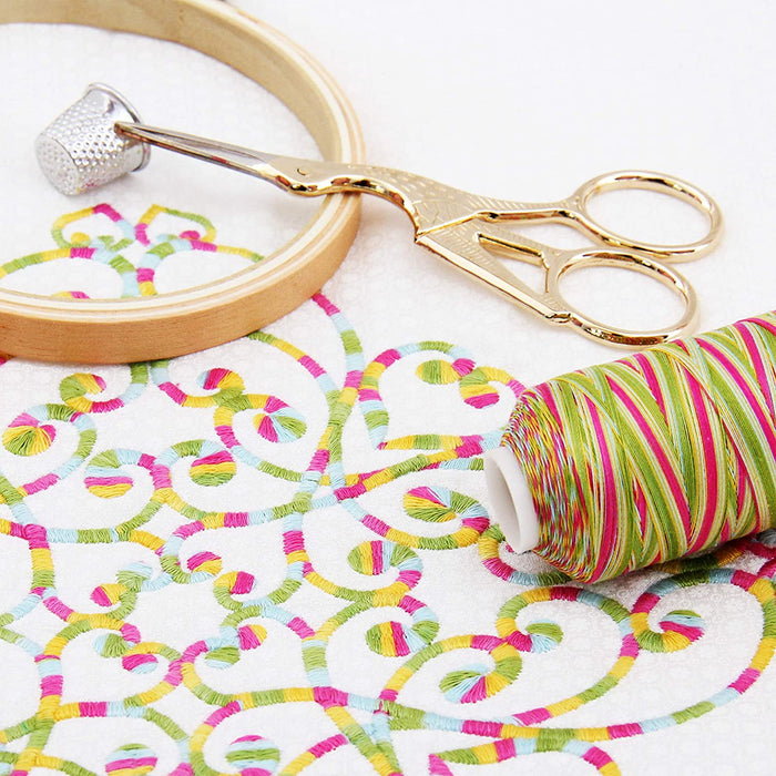 This 100% cotton thread has brilliant colors and excellent strength. Perfect for machine and hand quilting plus decorative stitching. Highly mercerized for low lint. Color changes every 4 - 6 inches for maximum variegated effects. We are confident you will be delighted with its strength and performance. 40 weight, 3 ply.