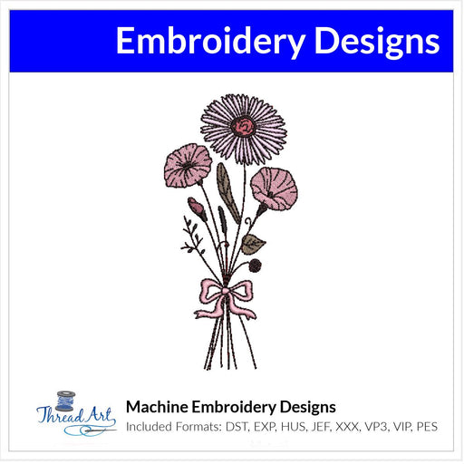 Single machine embroidery design. Set includes 5" tall floral bouquet and includes 8 popular formats: DST, EXP, HUS, JEF, VIP, PES, VP3, XXX. Conv...