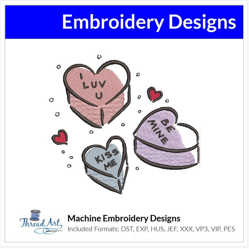 Valentine Trio of Candy Heart Machine Embroidery Design Instant Download - 6 Sizes - 8 Formats - ThreadArt