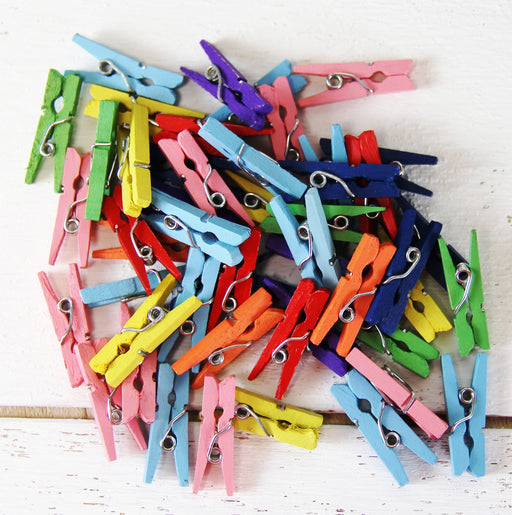 In stockA colorful array of mini wooden clothespin. 50 clothes pins per package.