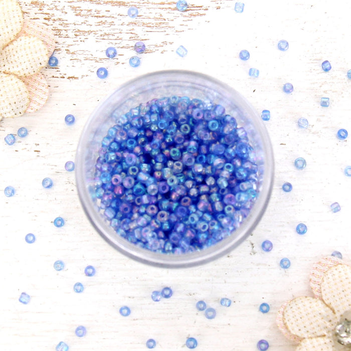 Size 12/0 round beads (2mm) with round hole (1mm). Translucent glass. 12 grams per package. Approximately 900.