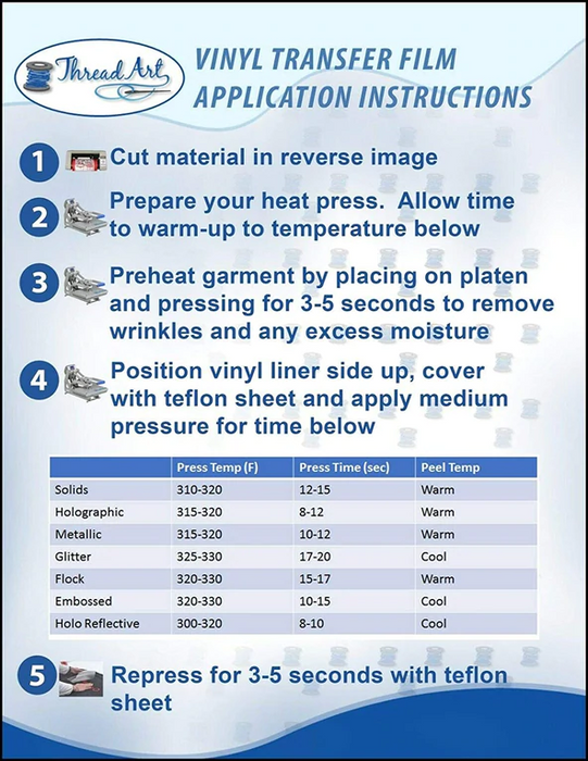 - Whether you are a beginner or a pro, you will find that using Threadart heat transfer vinyl is as easy as it can be! Made with customers in mind, Threadart heat transfer vinyl can be used by simply ironing it on anything you want or using a heat press machine. High-quality quality vinyl by the yard can easily be washed in hot or cold water in any washing machine for easy cleaning. Sticky carrier film helps with positioning and repositioning super easy before heat pressing.