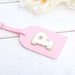 Personalized luggage tag. Stylish color selection includes pink, black or white. Each tag is personalized with an adorable chenille letter and is available in 3 elegant colors. Pink, ivory, or black.