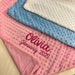 This personalized baby blanket is perfect for newborns and baby showers. The personalization is with beautiful embroidery. Add a name or words or date. One or two lines of text.